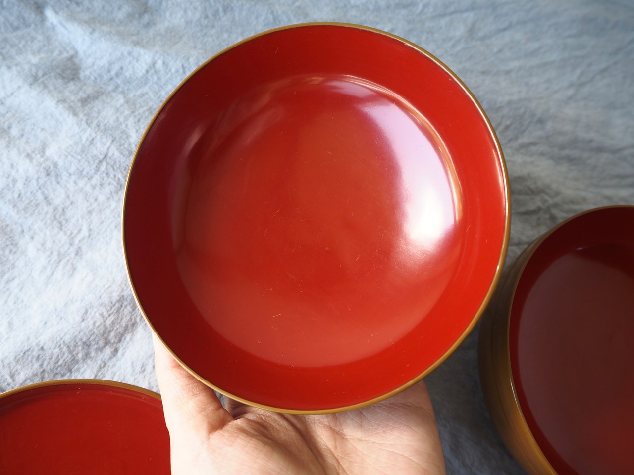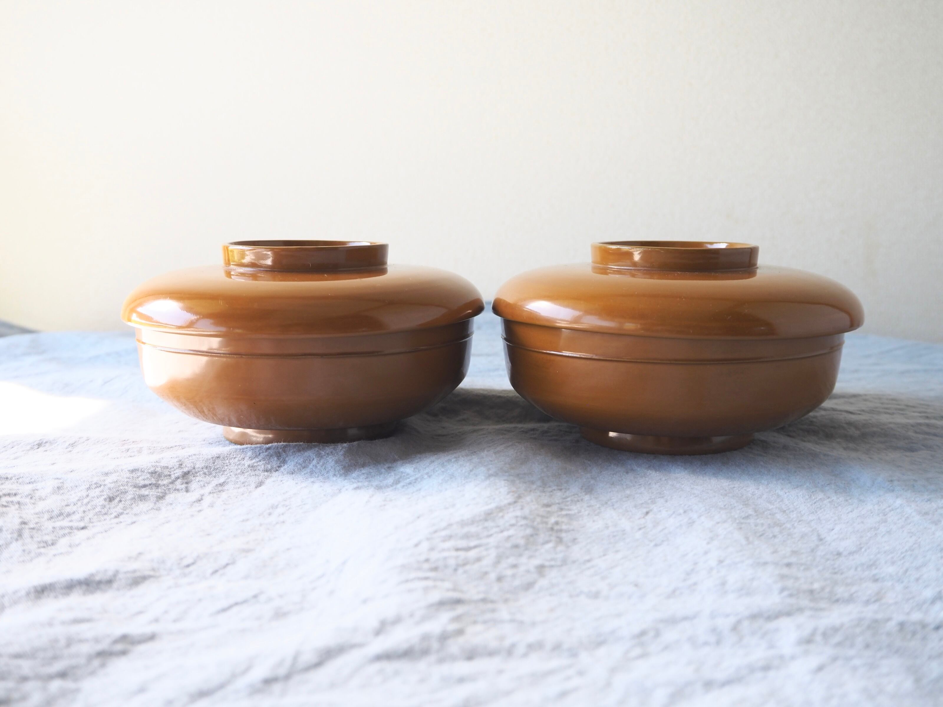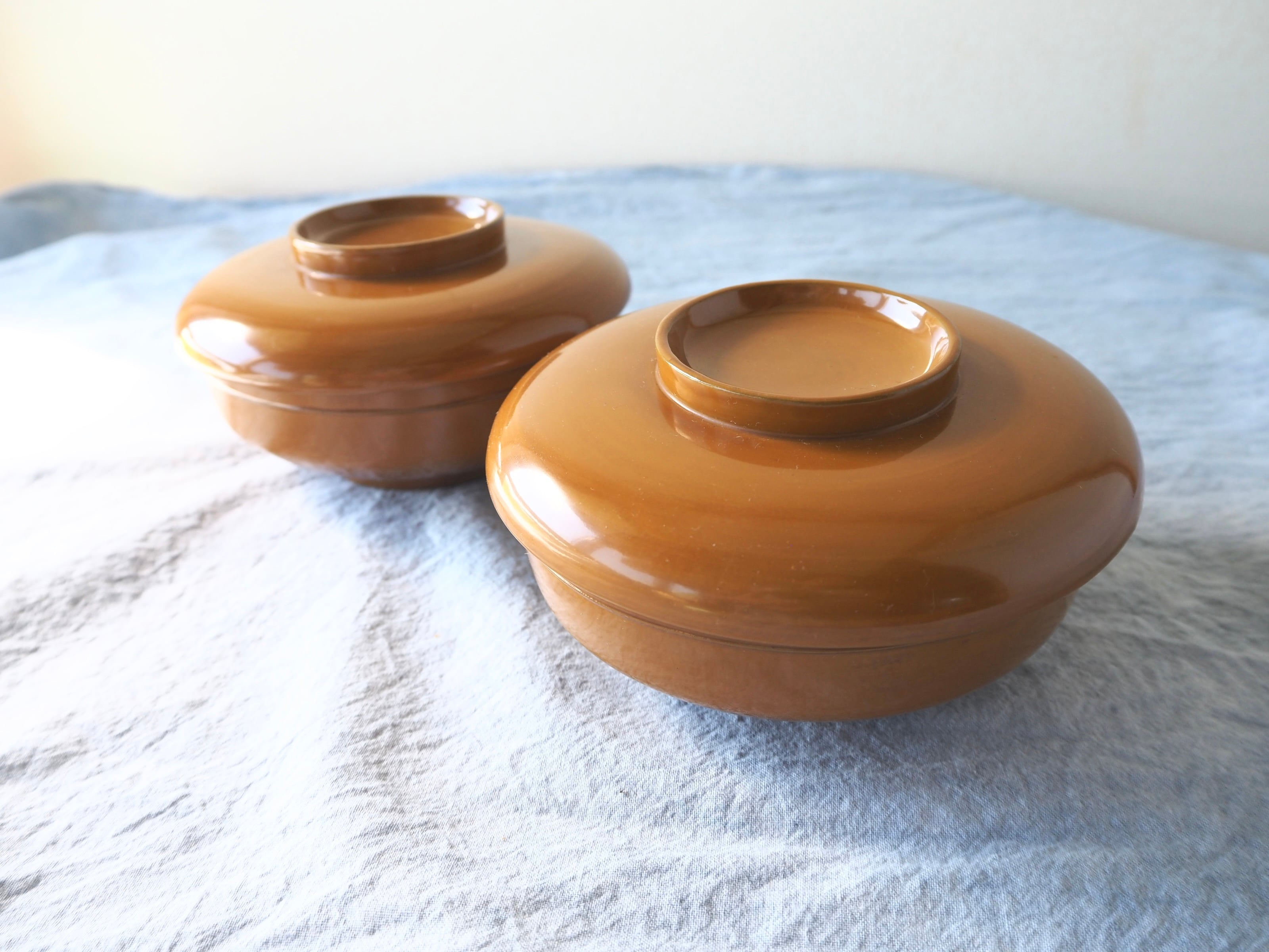 【古道具を暮らしに。 時代 黄漆 内朱塗 漆器 平椀 2客セット 懐石椀 煮物椀】のご紹介です。