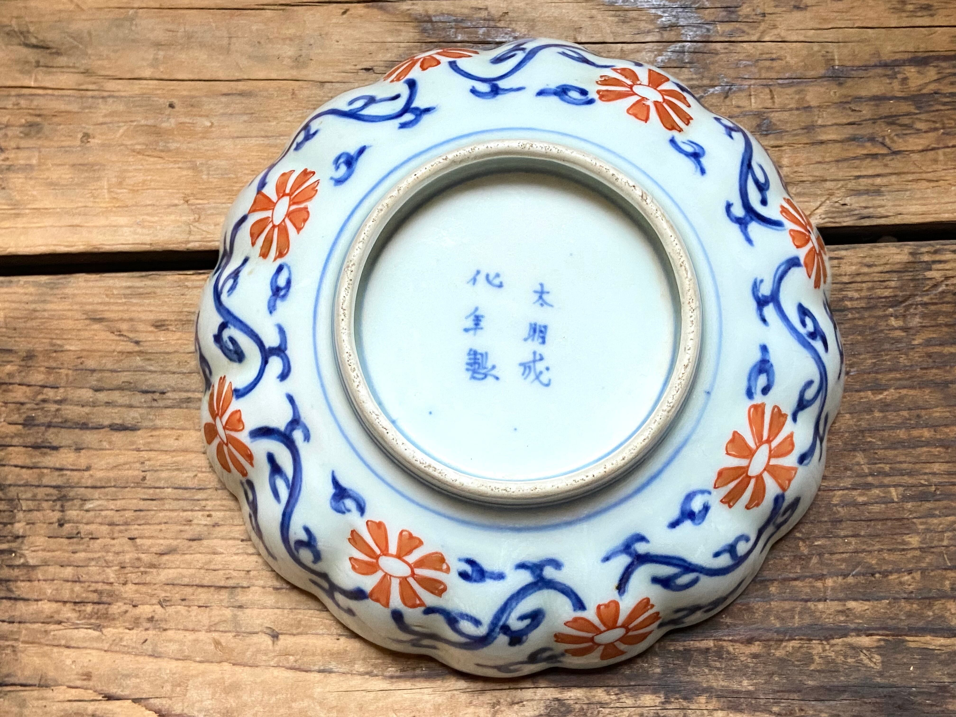 能登蔵出し 古伊万里 太明成化年製 銘有 赤絵 金彩 花唐草鳥文 輪花皿 /染錦