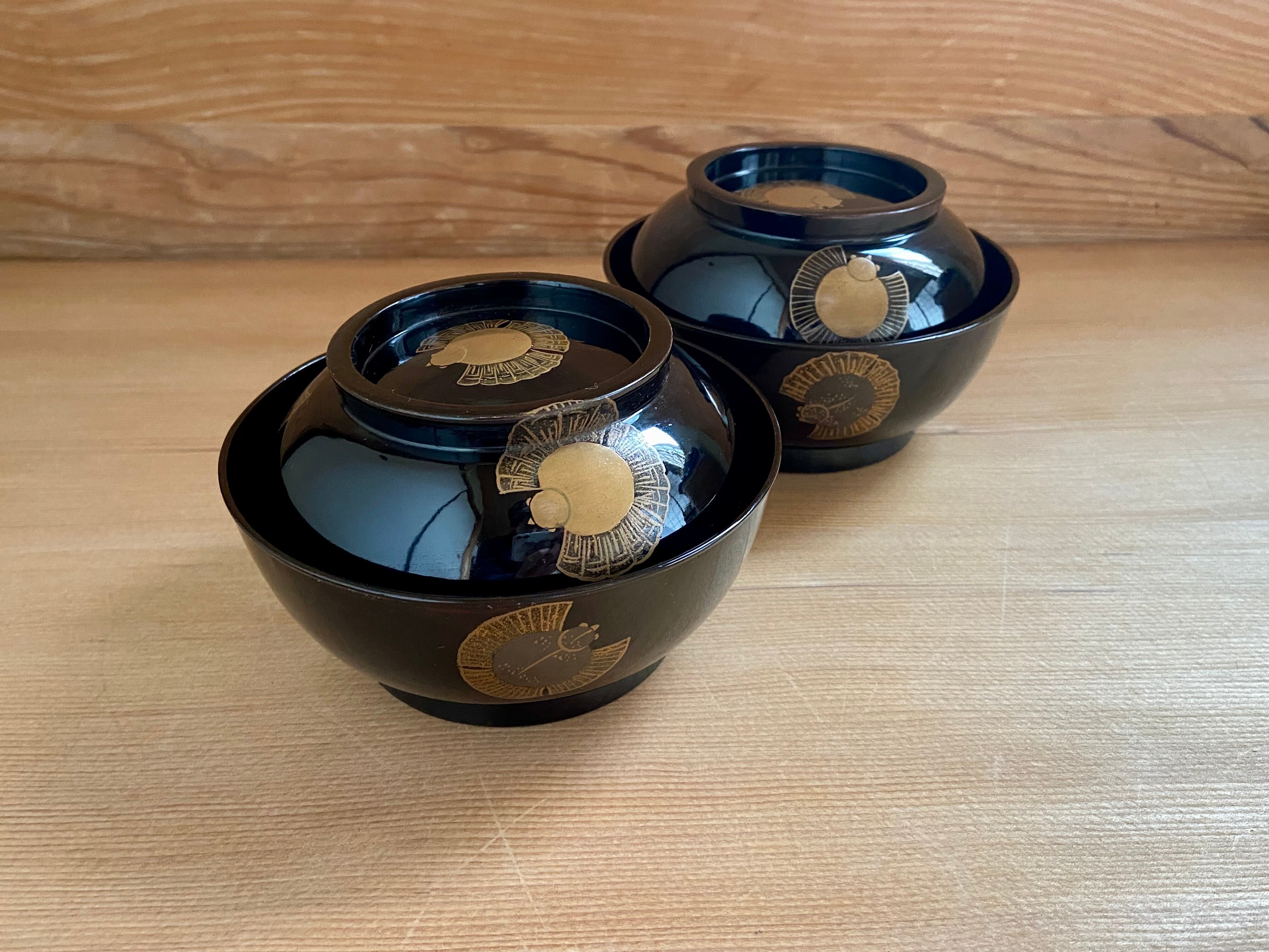 Black Lacquer Soup Bowls with “Fukura-Suzume” Maki-e .