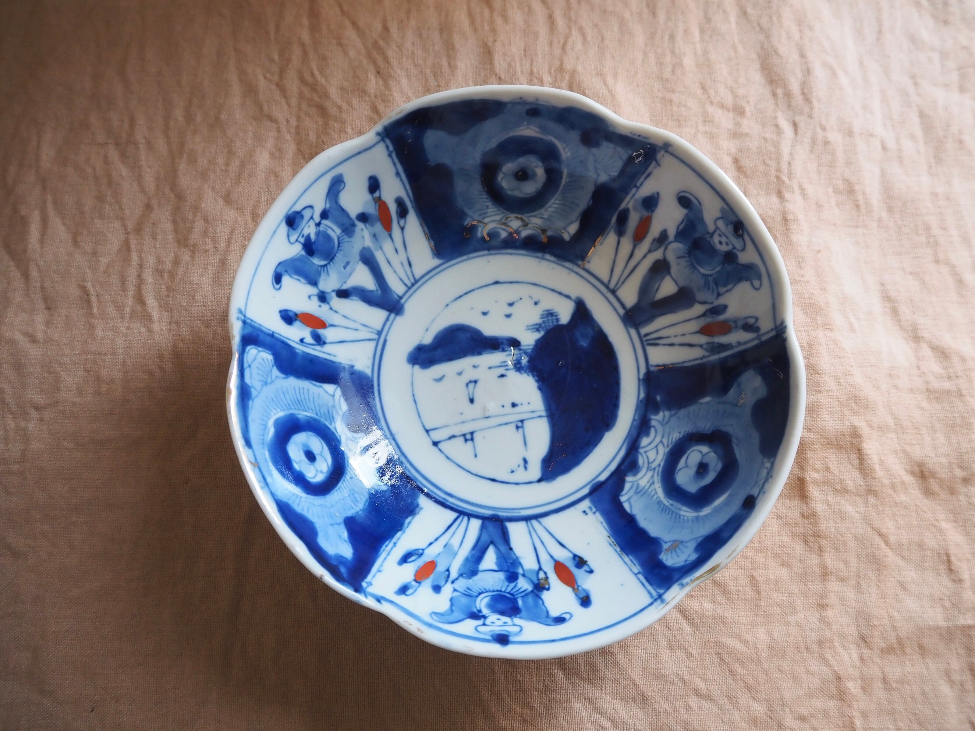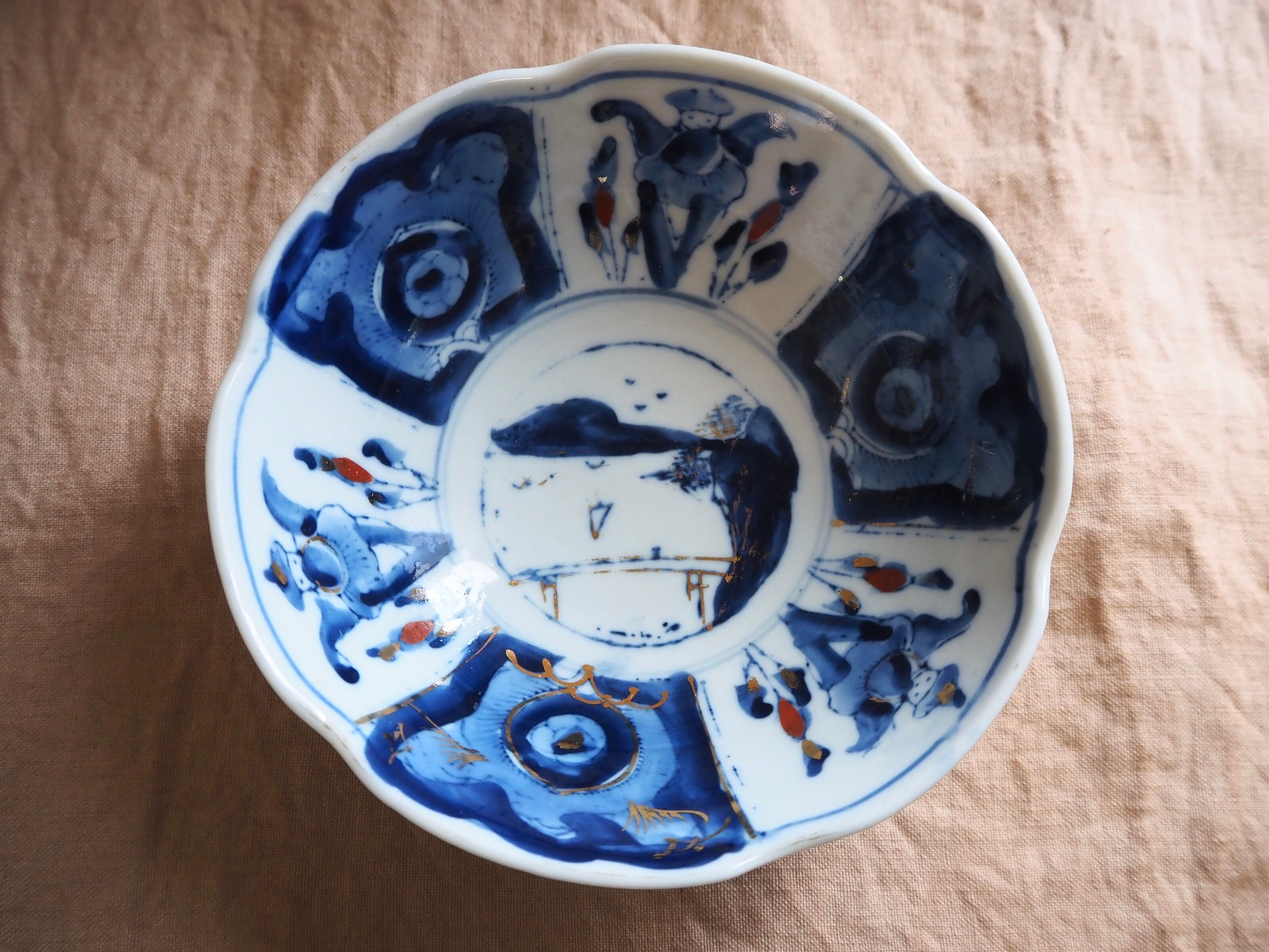 時代物 印判染付 金彩 小人 風景文 入れ子鉢セット